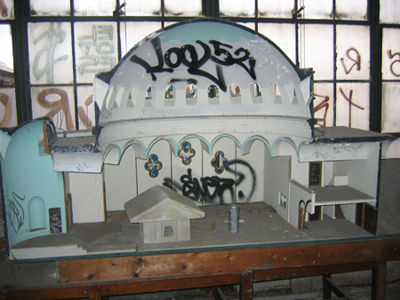 Left: Reminiscent of a Byzantine church, this miniature cross-section has been left to the taggers. Tiny street toughs must have smashed out the miniature replica stained ‘glass’ windows.