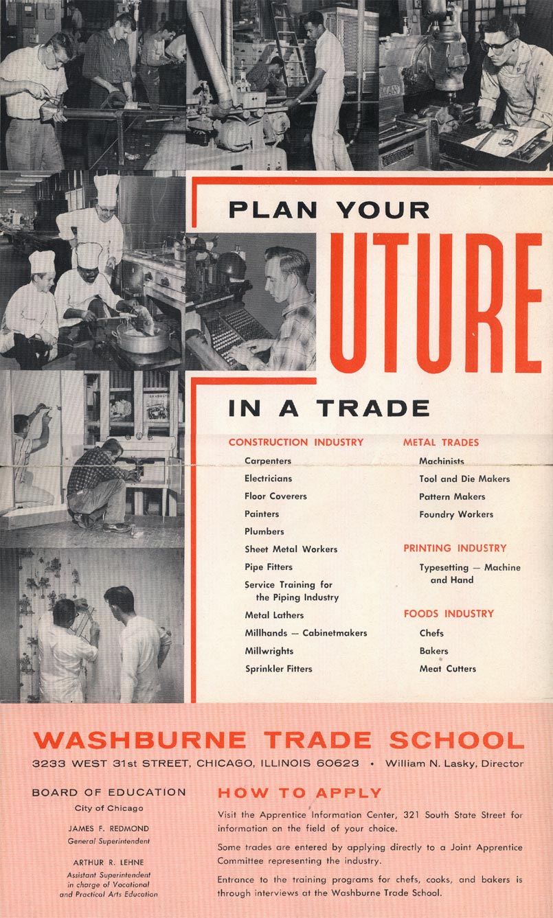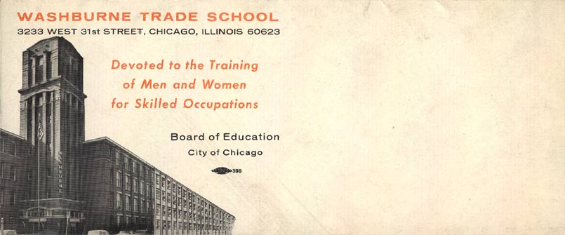 In 1887, Elihu Benjamin Washburne, a former Illinois congressman from Galena, died. Subsequently, West 14th Street elementary school was renamed in his honor. Located on 14th street near Union, the school continued as an elementary school until 1919, when it was re-named and re-purposed. With the sponsorship of numerous Unions, Washburne Trade and Continuance school began training high school age students for various vocational careers. Beginning with carpentry and electrical engineering, the school rapidly expanded its programs throughout the 1920’s.