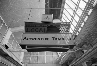 Right: This is a sign indicating the area used for training sheet metal workers, probably made by said students.