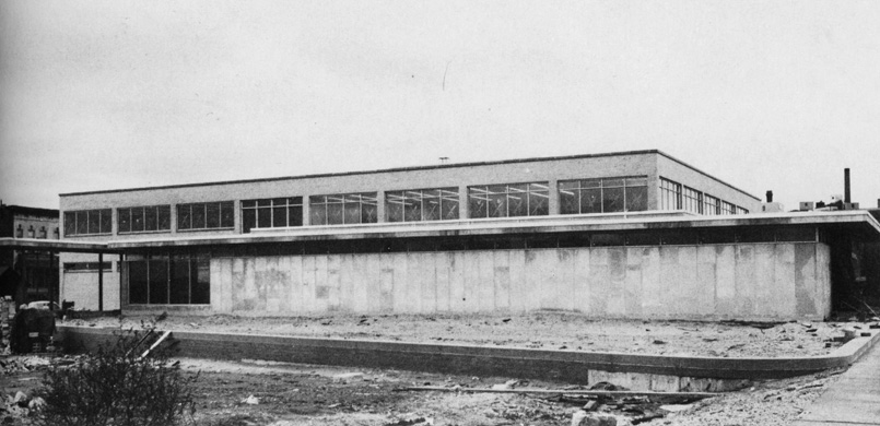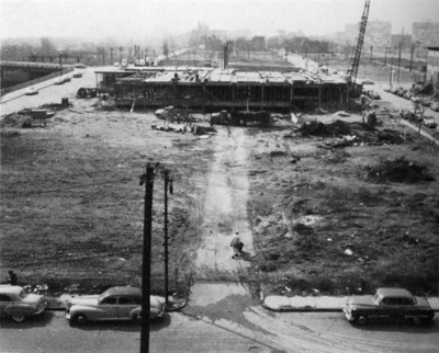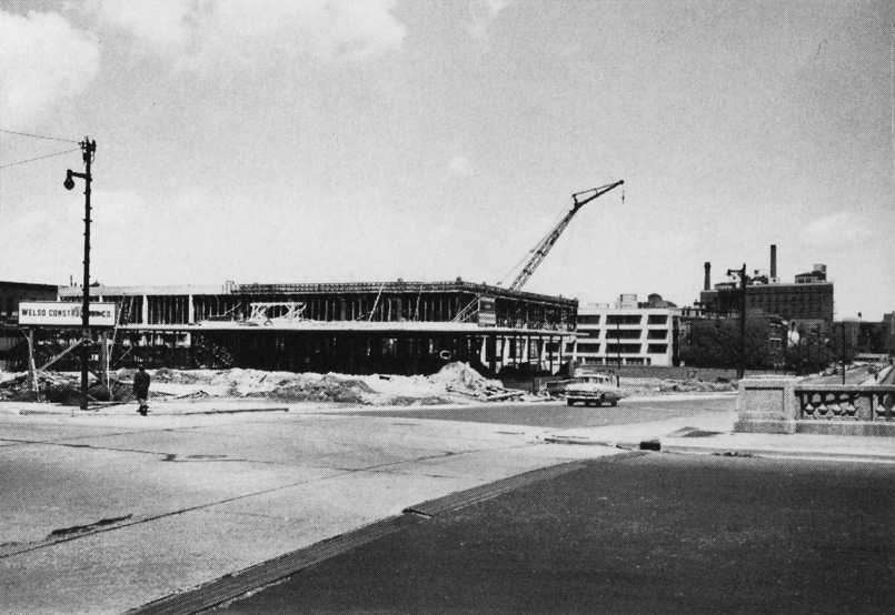 Right: The Pavilion under construction. It was designed by Loebl, Schlossman, and Bennett and is still extant, though it has also been somewhat buried in the construction of newer buildings.