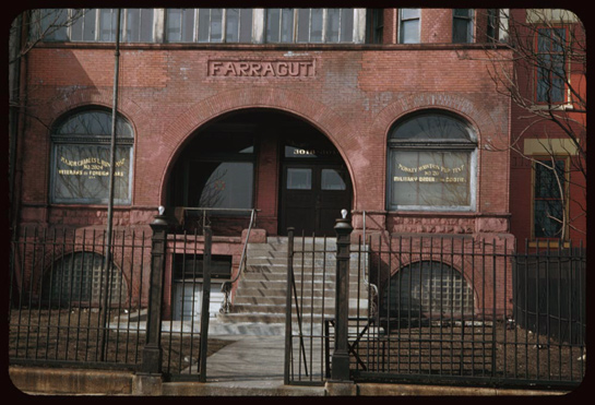A humble monument marks the spot where the game of softball was invented in 1887. This occured in the gymnasium at the Farragut Boat Club, which stood at 3018 S. Lake Park, on the current hospital grounds. Charles Cushman photographed the Farragut Club in 1949, shortly before it was demolished. It was seemingly used by some sort of veterans club at that time.