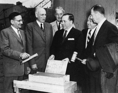 Then-Mayor Richard J. Daley preparing the cornerstone for the new Cummings Research Pavilion in 1957. |