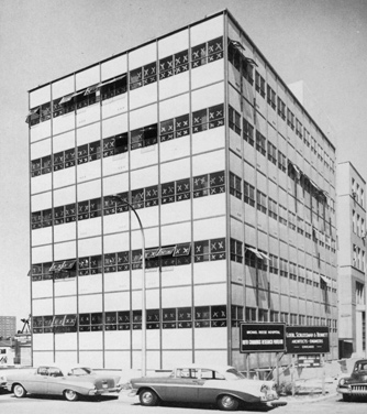 The Psychosomatic and Psychiatric Institute building was one of the first postwar structures built at the Michael Reese campus. This view looks north from 31st Street towards the building, which was designed by Loebl, Schlossman, and Bennett. It is now known as the Singer Pavilion. In a radical concept for psychiatric institutions at the time, it was designed on a small scale, and was meant to promote a cure rather than permanent care. The architects designed the building to avoid looking and feeling like a psychiatric institution, which at the time were typically foreboding structures with barred windows.5 Bennett mentions visiting such places, in an interview:6