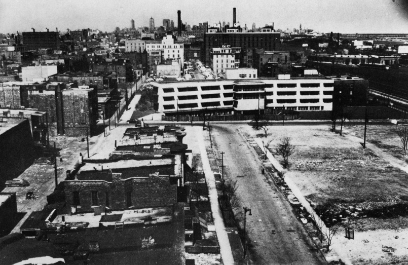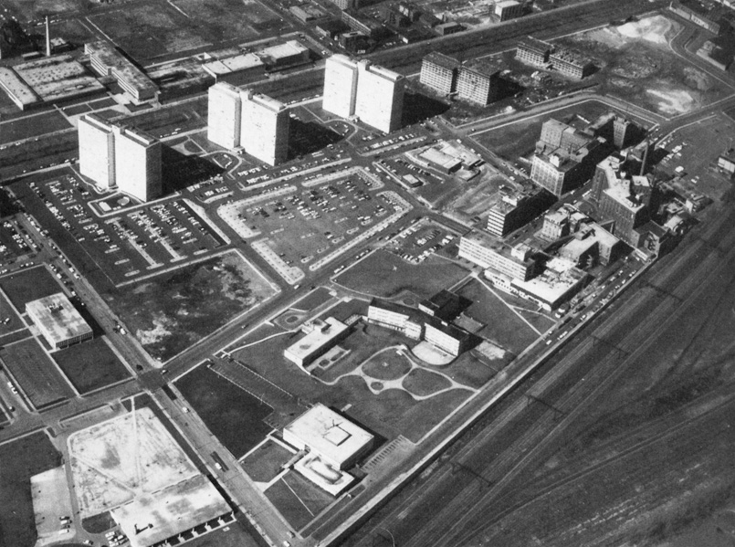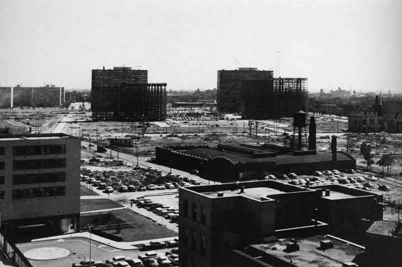 This view to the southwest of the hospital shows the Lake Meadows apartment complex under construction. Like the other numerous urban renewal projects surrounding the hospital, Lake Meadows succeeded in creating an integrated community, but it was at the expense of a dense neighborhood.