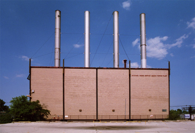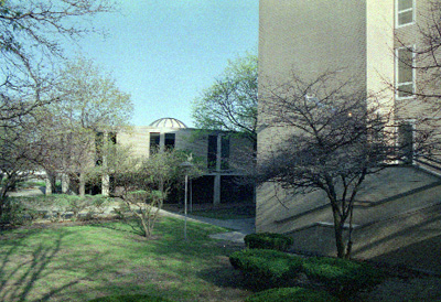 The parking lot just north of the main building, on which the heating plant is situated. The plant exhibits a Miesian modernist style, similar to the design of his heating plant at IIT a few blocks west.