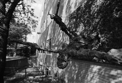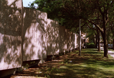 Right: The wall of the cleverly hidden parking lot behind the Bensinger building.