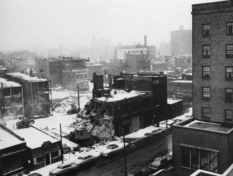 Left: Buildings on Cottage Grove being demolished for the construction of Kaplan Pavilion, designed by Loebl, Schlossman and Bennett. The Sarah Morris Children’s Hospital and Nelson Morris Research Institute are both behind the demolition. They eventually met the same fate.