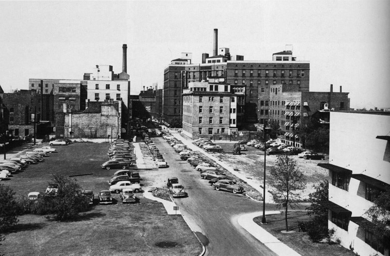 A 1950s view north towards the older part of the hospital campus. The empty and cleared land will soon become built upon.