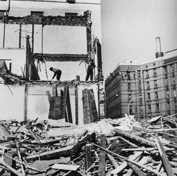 Right: The Serum Center was located diagonally and down Ellis from the main hospital building. Here, it is being demolished to make way for the Cummings Research foundation building.